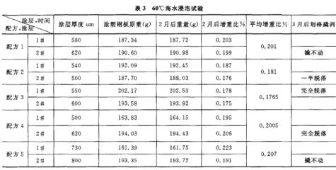 試驗過程:將不同填料的配方做出的粉末涂料樣品,涂塑在鋼板(3mm厚)上,每個配方涂塑兩個樣件,涂塑工藝都是200℃預熱30min,180℃固化30min。每種涂料做兩塊樣板,分別定為1#、2#。然后將涂塑好的樣件浸泡于60℃的海水中(海水取自上海奉賢海邊),浸泡時間為三個月。浸泡試驗結果列于表3中。